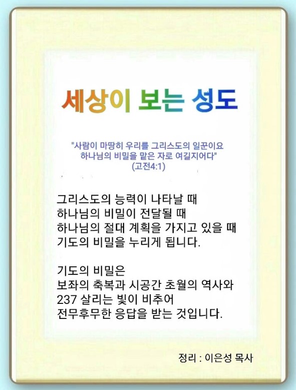 인터넷총국 (홈페이지 http://data.rutc.com) 후원: (국민은행) 856701-04-233309 (사)세계복음화전도협회 인터넷총국 분류 주일1부 예배- 2023년 제123RUTC응답 25 제목 세상이 보는 성도 성경 고린도전서 4:1-