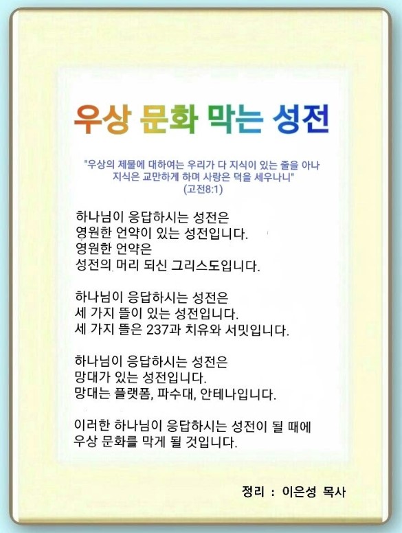 주일날 예배드릴 때 기도가 되어질 정도로 천천히 호흡을 들이쉬어야 됩니다. 이것을 하루 종일 할 수 있다면 흑암 망대를 무너뜨리는 굉장한 영적인 힘이 생깁니다. 우상 숭배하는 사람들은 틀린 것을 붙잡고 기도합니다. 네피림 충만한 이들이 만들어낸 우상 문화로 인해 정신병자는 급증하고 있습니다. 이것을 막는 성전을 만들어야 합니다. 고린도교회는 시장에서 파는 우상 제물을 먹는 일로 다투었습니다. 이들의 신앙이 우상 막는 시스템은 없으면서 우상 제물로 분쟁하는 수준이었습니다. 우리는 하나님이 응답할 수밖에 없는 정확한 언약을 잡아야 합니다. 그리고 세상을 살릴 만큼 영적 성장이 일어나야 됩니다. 지금이 후대를 영적 전쟁에서 살릴 수 있는 마지막 기회입니다. 우리는 성전 건축 후에 전 세계 문 닫는 교회를 살려내야 합니다. 그렇다면 하나님이 응답하실 수밖에 없는 성전은 어떤 성전일까요?