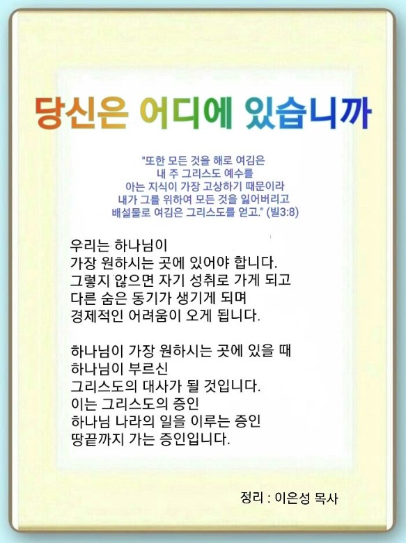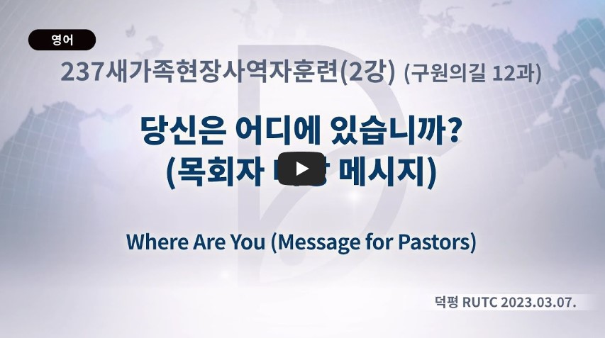 인터넷총국 (홈페이지 http://data.rutc.com) 후원: (국민은행) 856701-04-233309 (사)세계복음화전도협회 인터넷총국 분류 2023- 237새가족/현장사역자 수련회(구원의 길 교재) 제목 12과: “당신은 어디에 있