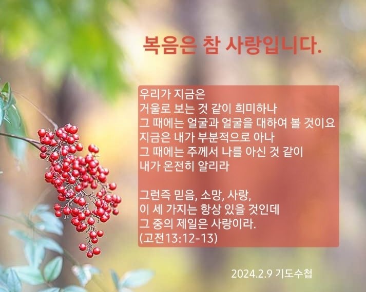 고린도전서 13:11-13 / 그런즉 믿음, 소망, 사랑, 이 세 가지는 항상 있을 것인데 그 중의 제일은 사랑이라 (13)