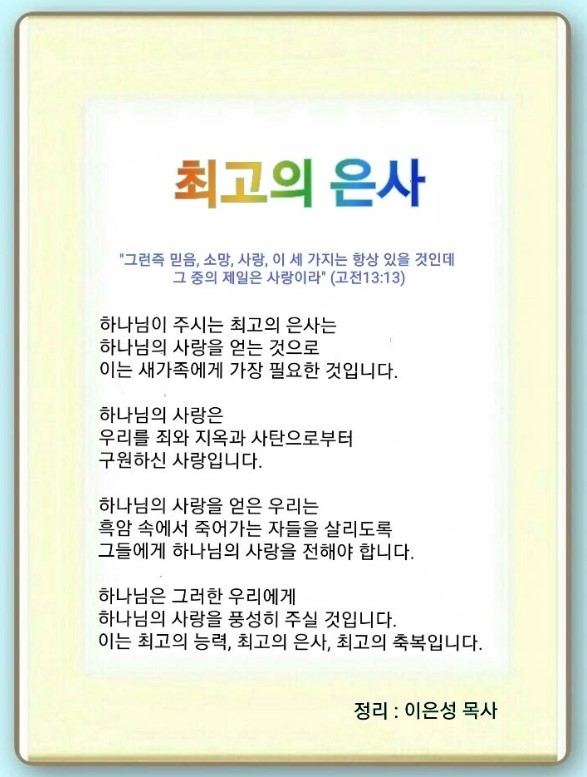 하나님의 아가페 사랑은 가장 큰 힘입니다. 이 사랑이 최고의 능력이고, 최고의 은사이며(고전 13:13), 최고의 축복입니다.