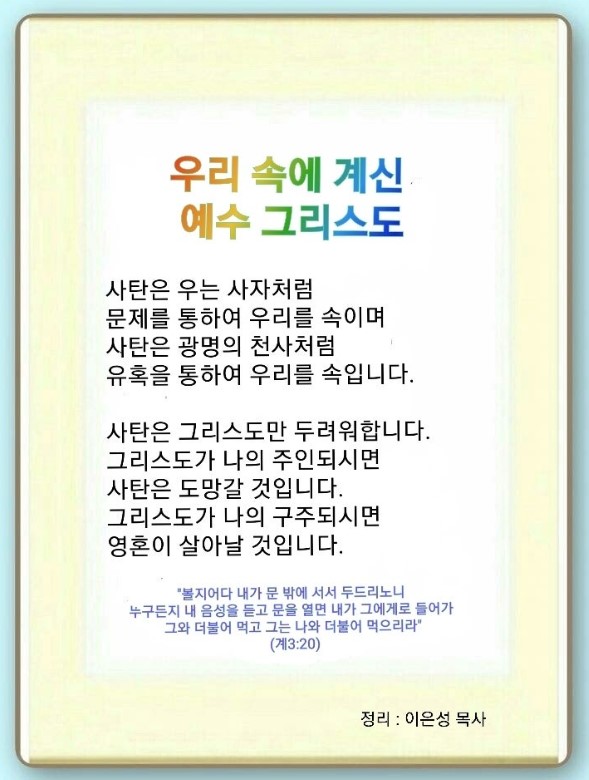 사탄은 그리스도만 두려워하기 때문에 그리스도를 구원의 주, 나의 주인으로 모시면 됩니다. 그리스도는 우리를 인도하시고 능력 주시기를 원하십니다. 이 사실이 삶의 1순위가 되어야 됩니다. 항상 세상 것을 자랑하지 않고, 언약에 순종하면서, 하나님의 뜻을 질문하면 됩니다.