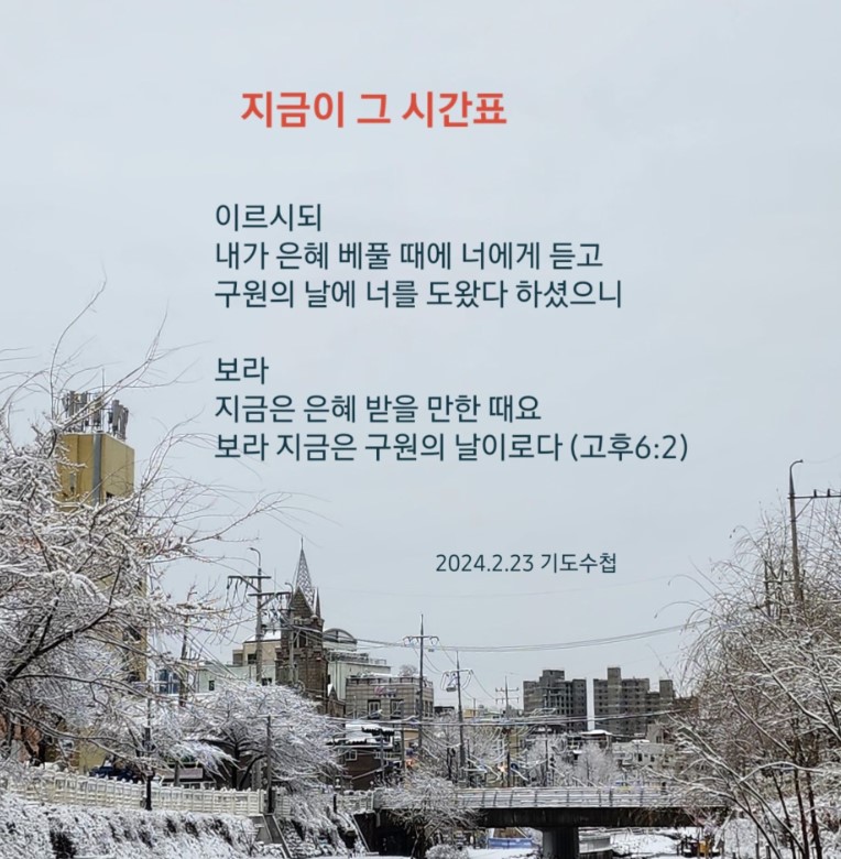 [구분] 주일 1부 [날짜] 2023. 7. 9. [강사] 류광수 목사 [정리] 사단법인 세계복음화전도협회 [제목] 지금이 그 시간표 [본문] 고후 6:1-13 1 우리가 하나님과 함께 일하는 자로서 너희를