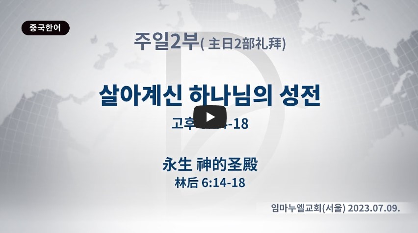 [구분] 주일 2부 [날짜] 2023. 7. 9 [강사] 류광수 목사 [정리] 사단법인 세계복음화전도협회 [제목] 살아계신 하나님의 성전 [본문] 고후 6:14-18 14 너희는 믿지 않는 자와 멍에를 함께