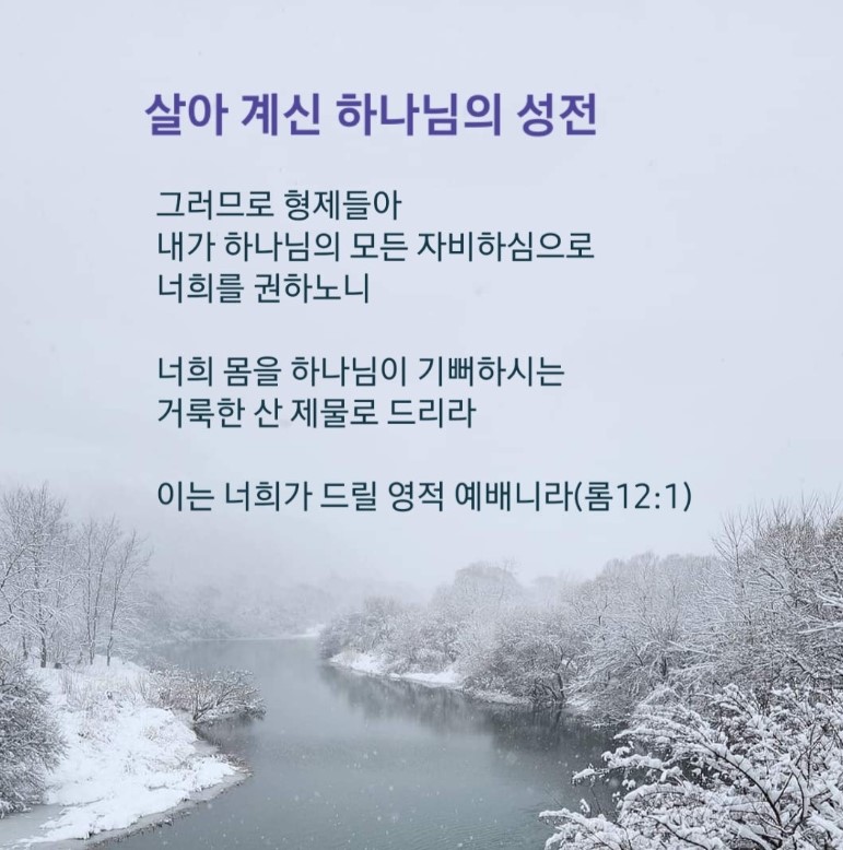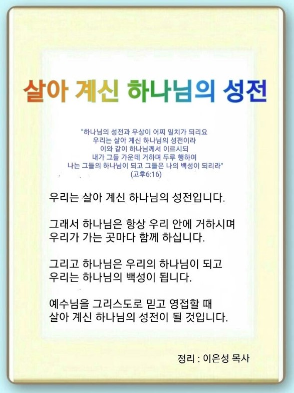 고린도후서 6:14-18 / 하나님의 성전과 우상이 어찌 일치가 되리요 우리는 살아 계신 하나님의 성전이라 이와 같이 하나님께서 이르시되 내가 그들 가운데 거하며 두루 행하여 나는 그들의 하나님이 되고 그들은 나의 백성이 되리라 (16)