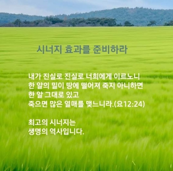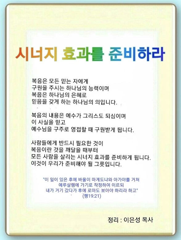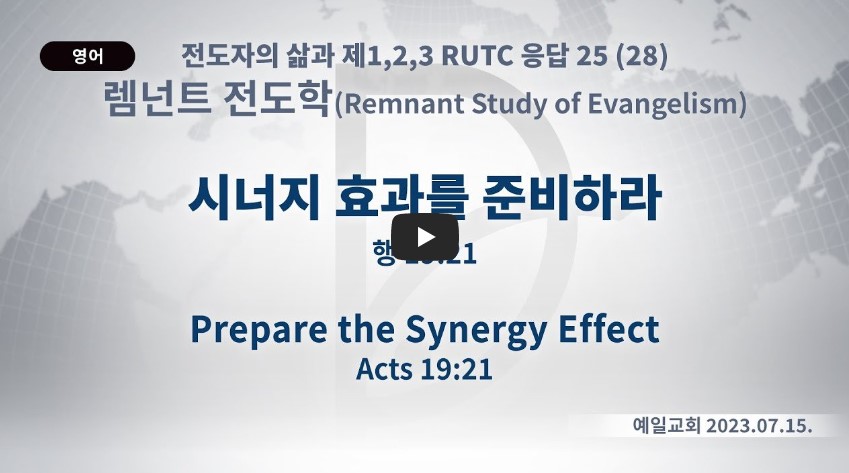 인터넷총국 (홈페이지 http://data.rutc.com) 후원: (국민은행) 856701-04-233309 (사)세계복음화전도협회 인터넷총국 분류 렘넌트전도학(2023-제123RUTC응답25)- 28 제목 (성공비밀4) 시너지 효과를 준비하라 성