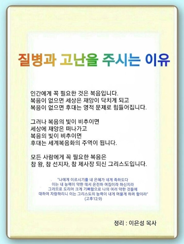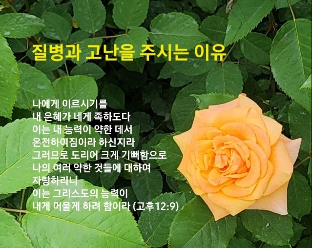 고린도후서 12:1-10 / 나에게 이르시기를 내 은혜가 네게 족하도다 이는 내 능력이 약한 데서 온전하여짐이라 하신지라 그러므로 도리어 크게 기뻐함으로 나의 여러 약한 것들에 대하여 자랑하리니 이는 그리스도의 능력이 내게 머물게 하려 함이라 (9)