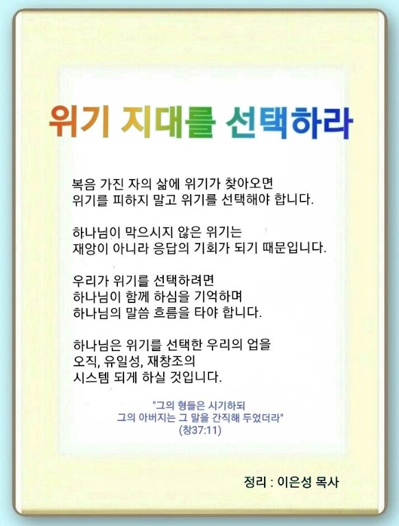 노예로 팔려간 요셉의 선택은 노예가 아닌 애굽이었습니다.(창 37:1-11) 감옥 갈 때도 다른 사람이 위기라고 생각하는 것을 선택했습니다. 모세 어머니는 모세를 왕궁으로 보내는 선택을 했습니다.(출 2:1-10) 한나는 사무엘을 성전으로 보내는 선택을 했습니다.(삼상 3:1-19) 다윗은 골리앗을 선택했고,(삼상 17:1-47) 엘리사는 지명수배된 엘리야의 수제자가 되었습니다.(왕상 19:19-21) 다니엘의 결단은 바벨론에 증거를 보이기 위한 선택이었습니다.(단 1:8-9) 예수께서 네 자녀를 위해 울라고 하셨습니다. 후대에 굉장한 고통이 올 것인데 그들을 살리는 선택을 하라는 것입니다.(눅 23:28)
