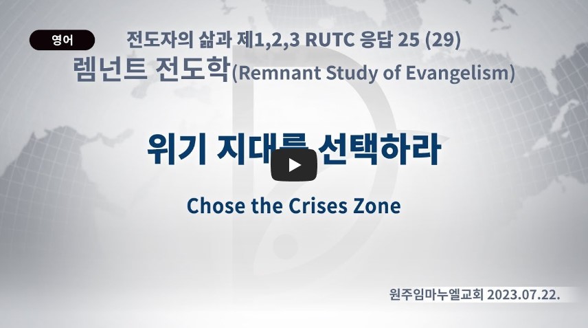 인터넷총국 (홈페이지 http://data.rutc.com) 후원: (국민은행) 856701-04-233309 (사)세계복음화전도협회 인터넷총국 분류 렘넌트전도학(2023-제123RUTC응답25)-29 제목 (성공비밀5) 위기 지대를 선택하라 성경