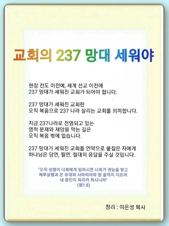 선교를 나가는 것도 중요하지만 그 전에 교회에 237 망대를 세워야 됩니다. 237 망대가 없는 교회는 하나님이 말씀하시는 교회가 아닙니다. 이스라엘이 이 말을 알아듣지 못해서 7재앙을 당했습니다. 하나님이 이스라엘의 재앙을 통해 237을 살리셨습니다. 렘넌트는 여기에 대한 자부심이 있어야 됩니다. 그리스도 안에 있는 렘넌트에게는 불가능, 이유, 핑계가 없습니다. 렘넌트는 어디서든지 살아남아 교회와 현장, 시대, 세계를 살립니다. 렘넌트가 이런 응답을 받을 수 있도록 핵심 메시지로 포럼 하고, 주일 강단에서 답을 얻는 금토일 시대를 준비해야 합니다. 세 가지 뜰을 준비하는 주역이 되게 하고, 실제 기도를 가르쳐야 됩니다. 그래야 플랫폼, 파수 망대, 안테나의 응답을 받게 됩니다. 렘넌트의 학업은 작품이(Heavenly, Throne, Eternally) 되어져야 합니다. 여기에서 힘과 달란트, 미션이 나와야 공부의 가치를 알게 되고, 사회 생활도 할 수 있습니다. 지금 전 세계로 전염되고 있는 영적 문제와 재앙을 막는 길은 복음밖에 없습니다.