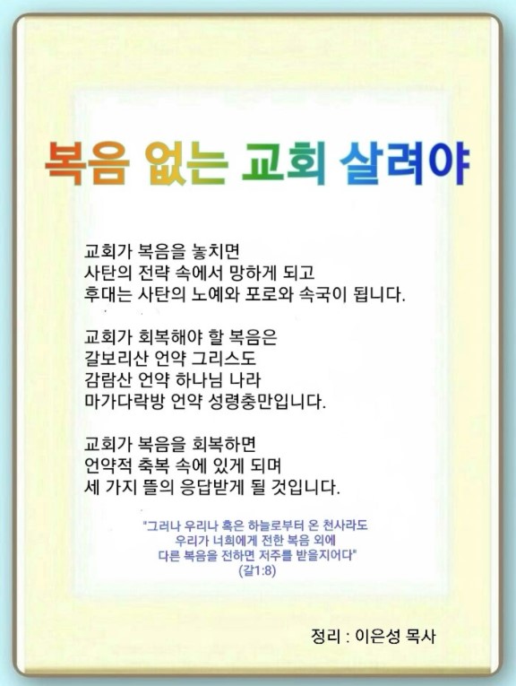 우리가 중요한 언약을 잡으면 하나님이 주시는 굉장한 응답이 옵니다.(출 14:19, 시 103:20-22, 왕하 6:15, 19:35, 단 6:20-22, 10:10-20, 행 12:1-25, 27:24, 계 8:3-5) 우리는 하나님의 능력으로 복음 없는 교회를 살리고, 세 가지 뜰을 만들어서 237·치유·서밋을 준비해야 합니다. 예수께서 갈보리산, 감람산, 마가 다락방에서 모든 것을 완성하셨기 때문에 237 기도의 망대를 세우고 파수꾼이 되어야 합니다. 문 닫는 교회와 복음 없는 나라, 전혀 복음을 못 듣고 있는 전 세계 후대를 살리고, 전도 모르는 237 지도자를 훈련시켜야 합니다. 특히 TCK와 장애인을 교회에서 훈련시키고, 렘넌트를 리더로 훈련시켜서 내보내야 합니다. 이를 위해 금토일 시대를 열어야 합니다. 예수께서는 남을 힘들게 한 적이 없으시지만, 딱 한 번 화를 내셨습니다. 세 가지 뜰이 없음을 보셨을 때입니다. 바울도 갈라디아교회를 향해 두 번이나 저주했습니다. 바울은 왜 갈라디아 교회를 보고 “다른 복음을 받으면 저주를 받을지어다”라고 말했을까요?