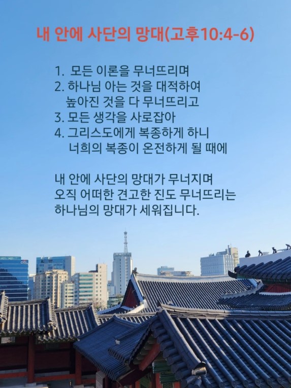 우리는 믿음으로 모든 사탄의 망대를 무너뜨려야 합니다. 그리고 하나님이 나에게 주신 것과 나의 현장을 찾아야 합니다. 세계복음화할 수 있도록 우리의 학업과 산업, 직업에 하나님의 망대를 세워야 합니다. 이 모든 것이 기도로 가능합니다.