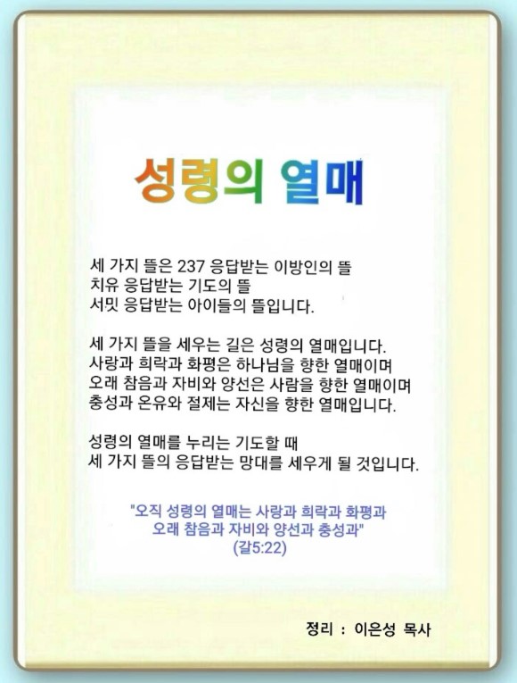 갈라디아서 5:22-26 / 오직 성령의 열매는 사랑과 희락과 화평과 오래 참음과 자비와 양선과 충성과 (22)
