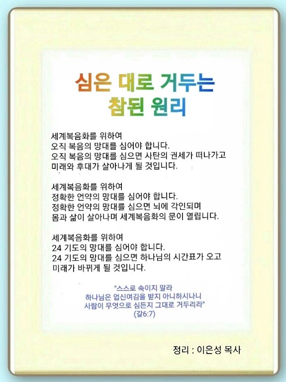인터넷총국 (홈페이지 http://data.rutc.com) 후원: (국민은행) 856701-04-233309 (사)세계복음화전도협회 인터넷총국 분류 주일1부 예배- 2023년 제123RUTC응답 25 제목 심은대로 거두는 참된 원리 성경 갈라디