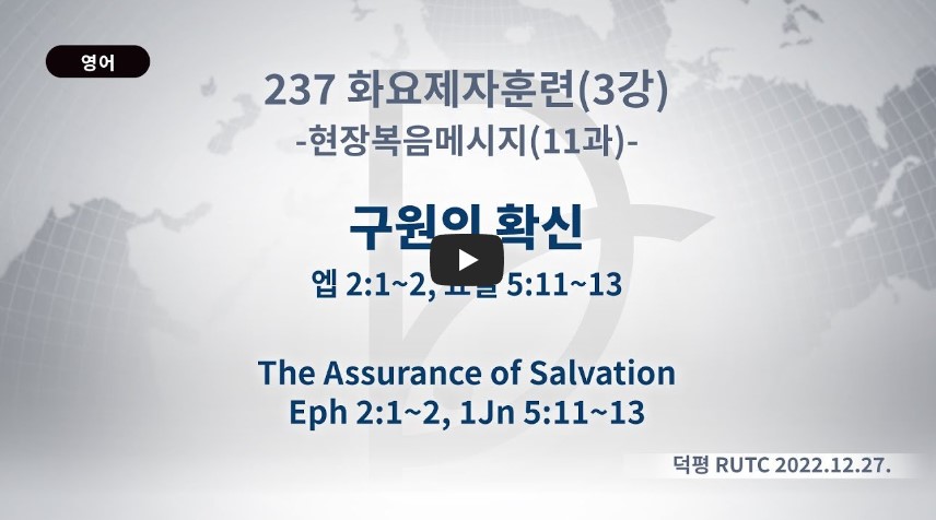 인터넷총국 (홈페이지 http://data.rutc.com) 후원: (국민은행) 856701-04-233309 (사)세계복음화전도협회 인터넷총국 분류 2022- 237화요제자훈련 제목 현장복음메시지 11과: 구원의 확신 성경 에베소서 2:1-2,