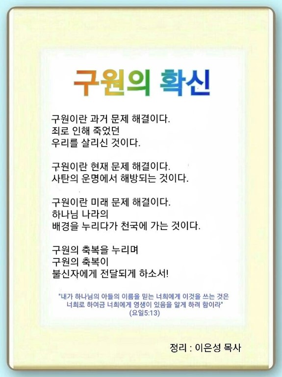 요한일서 5:11-13 / 내가 하나님의 아들의 이름을 믿는 너희에게 이것을 쓰는 것은 너희로 하여금 너희에게 영생이 있음을 알게 하려 함이라 (13)