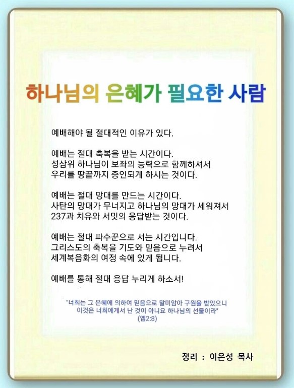 우리가 예배해야 될 이유가 무엇입니까? 예배에 대한 절대적인 이유를 찾아야 됩니다. 교회의 청년들은 말씀의 증인, 세 가지 뜰의 증인, 미래 중직자 준비의 증인이 되어야 됩니다. 영적으로나 정신적으로 어려움을 당하는 사람들은 자신이 절대 나을 수 없음을 알아야 합니다. 그래서 잘못된 각인을 바꿔 주어야 합니다. 우리의 근본 문제의 시작은 창 3·6·11장입니다. 창 3·6·11장 문제는(우상, 종교, 명상운동, 문화 장악) 지금도 계속되고 있습니다. 우리의 싸움은 사탄과의(통치자, 권세자, 어두움의 세상 주관자, 하늘에 있는 악의 영들) 싸움입니다.(엡 6:12) 그래서 하나님은 이방인이었던 우리에게 그리스도를 보내셨습니다. 그리스도를 믿게 하사 우리를 살리시고 성전 삼으신 것입니다.(엡 2:8, 11-18, 22) 이 사실을 알아야 치유됩니다. 사도 바울은 에베소서를 통해 세 가지를 설명했습니다.