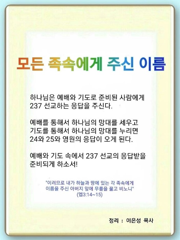 기도와 상관없이 오는 더 큰 응답이 세계를 살리는 응답입니다. 하나님은 준비된 사람에게 237 선교를 주십니다. 바울은 항상 237을 두고 간절히 기도했습니다. 우리는 원죄와 자범죄로 죽었기 때문에(엡 2:1) 공중권세 잡은 자를 따라다녔습니다.(엡 2:2) 정사와 권세, 하늘에 있는 악의 영, 흑암의 주관자들은 세계화를 이루었습니다.(엡 6:12) 흑암 권세는 시공간을 초월해서 후대에 역사합니다. 그래서 우리의 싸움은 영적 문제를 세계화하는 흑암과의 싸움입니다. 바울은 이스라엘이 곧 멸망하여 그 후대가 전 세계로 흩어질 것과 로마 재앙이 세계 재앙이 될 것을 알았습니다. 그래서 간절한 마음으로 편지하고 기도했습니다. 예수께서는 예배를 통해서 성삼위 하나님과 보좌의 능력, 3시대 살릴 힘, 우주를 다스리는 능력, 땅끝까지 갈 권능, 세 가지 뜰을 누리라고 하셨습니다. 이것을 정시로, 무시로 누리면 25와 영원의 응답이 오고, 세 가지 답이 나옵니다.
