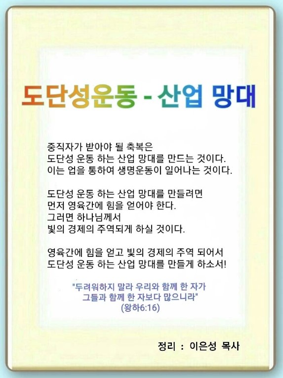 중직자가 받아야 될 축복은 도단성운동 하는 산업 망대를 만드는 것입니다. 우리의 업을 통해 생명운동이 일어나서 금토일 시대의 증인으로 현장에 가야 됩니다. 이를 위해 먼저 영육간에 힘을 얻어야 합니다. 성삼위 하나님과 보좌의 축복 9가지가 내게 임하고 현장에 전달되게 해야 합니다. 또 3시대의 능력과 흑암 권세, 공중 권세 잡은 자를 꺾는 권능과 5력이 임하도록 기도해야 합니다. 이때 하나님이 나에게 미리 CVDIP를 주십니다. 그리고 세 가지 뜰이 나와 내 업에 임하도록 계속 기도하면 됩니다. 그러면 우리의 업이 교회와 후대를 살리는 망대가 되고, 도단성과 세 가지 뜰이 됩니다. 이 도단성운동의 주역은 많은 후대입니다. 우리가 하는 작은 헌신이 7천 제자의 시작이 됩니다. 이 도단성운동의 경제 배경이 되는 사람이 중직자입니다. 여기에 쓰이는 경제가 빛의 경제입니다. 중직자가 기도하는 시간에 어떤 일이 일어날까요?