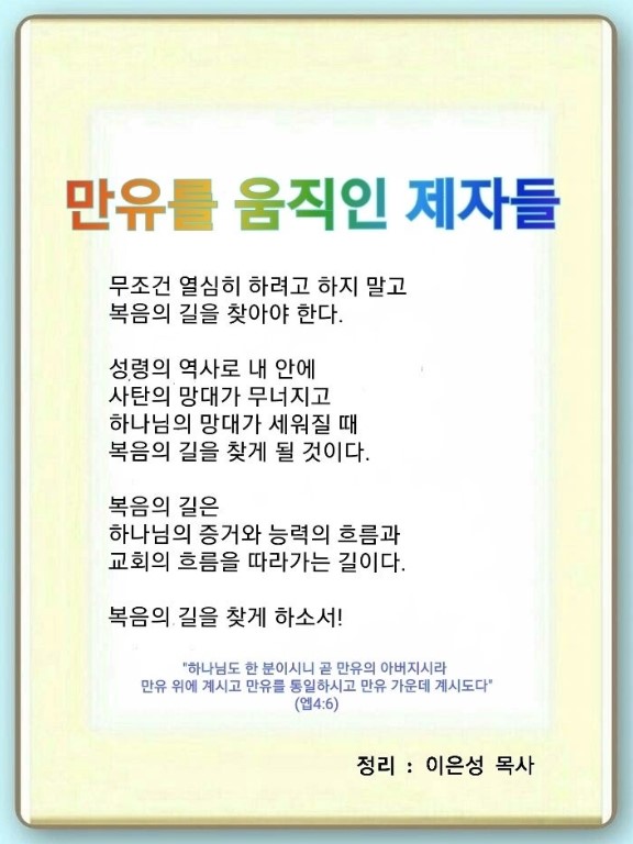 우리는 힘이 없기 때문에 하나님의 능력으로 사람들을 살려야 합니다. 하나님은 평안으로 하나되게 하고, 만유의 아버지이며, 만물을 충만케 하시는 분입니다.(엡 4:3, 6, 10)