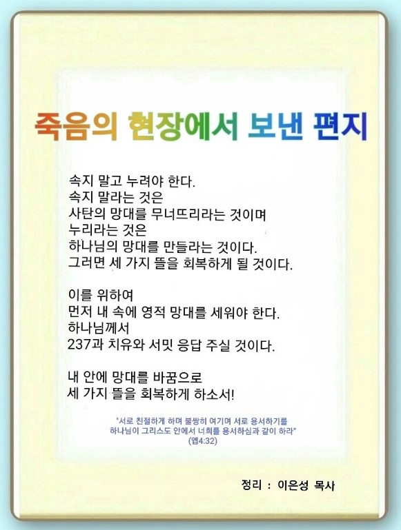 그러면서 세 뜰을 회복하라고 했습니다. 생존경쟁 속에서 고난 당하는 사람들이 교회로 오게 해야 됩니다. 서로 친절하게 대하고,(엡 4:32) 불쌍히 여기고, 용서해야 됩니다.