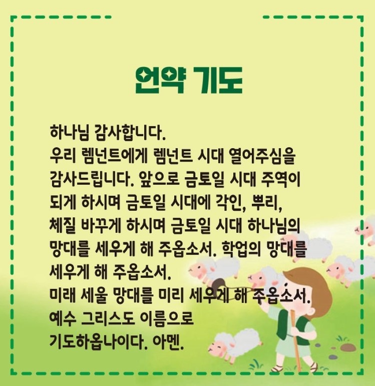 하나님 감사합니다. 우리 렘넌트에게 렘넌트 시대 열어주심을 감사드립니다. 앞으로 금토일 시대 주역이 되게 하시며 금토일 시대에 각인, 뿌리, 체질 바꾸게 하시며 금토일 시대 하나님의 망대를 세우게 해 주옵소서. 학업의 망대를 세우게 해 주옵소서. 미래 세울 망대를 미리 세우게 해 주옵소서. 예수 그리스도 이름으로 기도하옵나이다. 아멘.