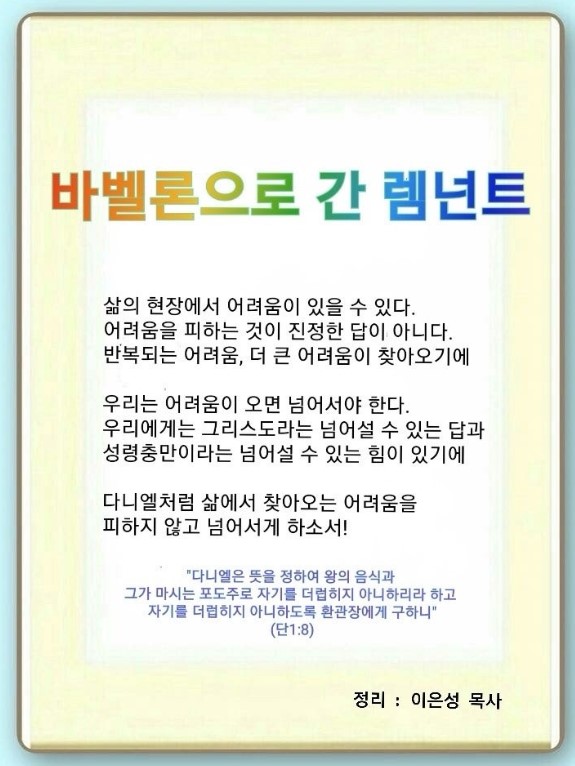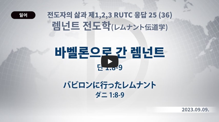 인터넷총국 (홈페이지 http://data.rutc.com) 후원: (국민은행) 856701-04-233309 (사)세계복음화전도협회 인터넷총국 분류 렘넌트전도학(2023-제123RUTC응답25)- 36 제목 바벨론으로 간 렘넌트 성경 다니엘 1:8-9