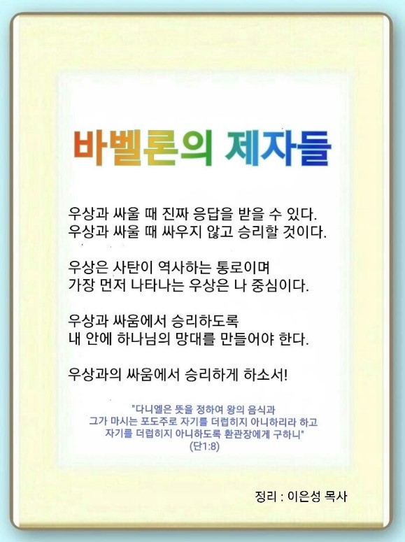 사탄과 우상을 알고 기도만 해도 진짜 응답을 받을 수 있습니다. 그래서 우리에게 시공간 초월의 축복과 하나님의 나라라는 기도의 비밀을 주셨습니다. 이것을 안 성경의 사람들은 시대를 바꾸는 응답을 받았습니다. 가장 먼저 나타나는 우상은 ‘나’입니다. 여기에서 에덴 사건이 벌어졌습니다. 사탄이 ‘나’를 네피림으로, 우상으로 만들어서 홍수 시대가 일어났습니다. 내 안에 완전히 사탄의 망대가 섰습니다. 이것이 바벨탑 사건입니다. 사탄의 우상이 종교로 둔갑해서 어마어마한 형상이 있는 신전을 세웠습니다. 이것이 사람을 흑암으로 몰아갑니다. 사람들은 미래를 염려하기 때문에 끊임없이 점술이 유행하고 있습니다.(행 13, 16, 19장) 이것이 문화와 정치로 둔갑했습니다. 여기에 많은 사람과 경제, 정치가(사회) 따라갑니다. 이것을 해결하기 위해 찾아간 유일한 인물이 바울입니다. 영적 사실을 아는 한 사람의 기도로 역사가 일어나는 것입니다. 그래서 하나님이 바울을 쓰실 수밖에 없었습니다. 영적 사실을 아는 다니엘과 그 친구들에게 어떤 응답이 왔을까요?