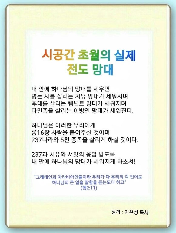 예수께서는 40일 동안 하나님 나라를 설명하셨습니다. 그래서 내 안에 하나님 나라를 이루는 망대를 세우는 것입니다. 그리고 오직을 말씀하셨습니다. 여기서 유일성, 재창조가 나옵니다. 이것이 교회 망대입니다. 땅끝, 모든 족속, 만민에게 가라고 하셨습니다.(행 1:8, 마 28:16-20, 막 16:15-20) 이것은 시공간 초월이 아니면 불가능합니다. 성삼위 하나님과 보좌의 능력, 3시대 살리는 능력을 누리는 영적 시스템의 망대로만 가능한 것입니다. 3단체는 이미 시공간 초월의 능력으로 네피림운동을 하고 있습니다. 3차 산업을 장악하고, 전 세계를 영적 팬데믹 상태로 만들었습니다. 그러므로 네피림이 가장 싫어하는 ‘빛’을 나와 현장에 비추는 영적 망대를 세워야 됩니다.(창 1:3, 사 60:1-2, 마 5:15-16, 요 1:11, 벧전 2:9) 실제 시공간 초월의 전도 망대를 만들어야 합니다.(행2:9-11) 이때 다른 힘이 생깁니다.(요 14:16, 14:26, 행 1:8) 빼앗겨 버린 세상과 우주를 회복하는 보좌의 다른 세계가 보입니다.(요 3:16, 엡 2:2, 행 1:3) 또 성삼위 하나님과 보좌와 시공간 초월의 다른 망대가 생겨납니다.