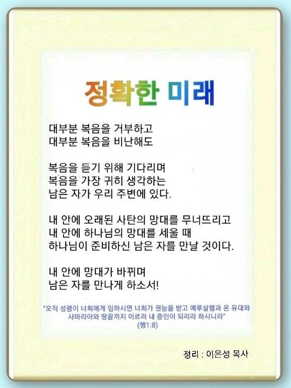 내게 주어진 7미션이 있습니다. 내 속에 하나님의 망대를 세우는 것입니다.(제1 미션) 그래서 오직,(갈보리산) 유일성,(감람산) 재창조의(마가 다락방) 망대가 만들어져야 합니다.(제2 미션) 또한 시공간 초월하는 능력으로 나의 땅끝과 237을 찾아내야 합니다.(제3, 4 미션) 그리하여 기도의 능력과 정확한 미래를 가지고 가는 것입니다.(제5, 6 미션) 성경의 인물들 중 하나님의 정확한 미래를 붙잡고 끝을 안 사람들은 다 응답받았습니다. 성삼위 하나님과 보좌의 능력, 3시대 살릴 답이 내게 각인, 뿌리, 체질 되면 정확한 미래가 보입니다.(요 14:16, 14:26, 16:13) 또 하늘 군대를 보내사 역사하십니다.(출 14:19, 왕하 19:35, 시 103:20-22, 단 10:10-20, 행 27:24) 이제 하나님이 주신 절대 미래를 봐야겠습니다.