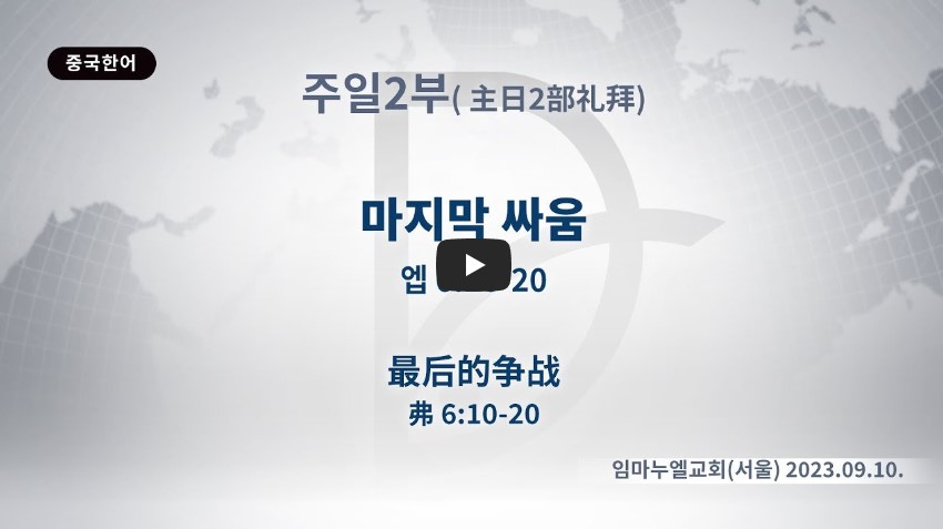 인터넷총국 (홈페이지 http://data.rutc.com) 후원: (국민은행) 856701-04-233309 (사)세계복음화전도협회 인터넷총국 분류 주일2부 예배- 2023년 제123RUTC응답 25 제목 마지막 싸움 성경 에베소서 6:10-20 일시/