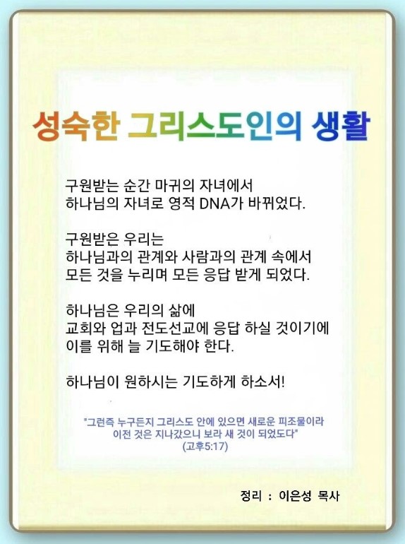 실제 성숙해야 될 것이 있습니다. 유대인들이 율법으로 다툴 때 강대국은 세계를 장악했습니다. 교회가 육신적인 응답에 집중할 때 3단체는 영적 작품을 만들었습니다. 우리가 겨우 1시간으로 예배를 끝낼 때 이 사람들은 네피림운동을 하고 있습니다. 우리가 복음을 누리지 못하는 종교생활을 하고 있을 때 이들은 청빈, 검소, 무소유, 해탈, 무아지경, 다른 세계를 내놓았습니다. 모든 종교단체는 수행 과정을 가지고 있는데 우리는 영적 훈련시키는 곳이 없습니다. 우리에게 ‘영적 성숙’이 일어나야 됩니다. 우리는 그리스도를 누리면서(마 16:16) 재창조의 축복을 받아야 합니다.(고후 5:17) 갈 2:20을 이해해야 역사가 일어납니다. 감사와 판단의 기준이 하나님이 되면 참된 성숙이 됩니다.(Coramdeo) 성공과 응답이 와도 전부 하나님께 영광을 돌립니다.