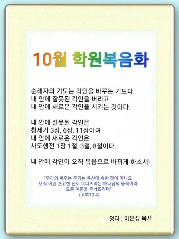 인터넷총국 (홈페이지 http://data.rutc.com) 후원: (국민은행) 856701-04-233309 (사)세계복음화전도협회 인터넷총국 분류 핵심훈련(2023-제123RUTC응답25)- 38 제목 (렘넌트데이) 학원복음화 10월 성경 일시/장