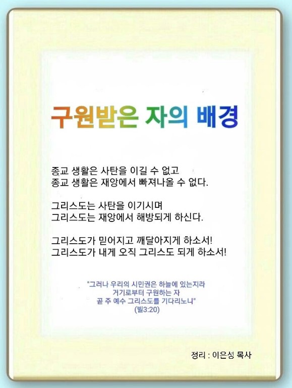 과거를 정확하게 아는 자는 과거에서 해방될 수 있습니다. 바울은 이스라엘이 노예, 전쟁, 포로, 속국 된 이유를 깨달았습니다. 복음을 깨닫지 못한 종교 생활은 우상 숭배와 똑같습니다. 종교 생활은 절대 사탄을 이길 수 없고, 인간을 재앙에서 빠져나오게 할 수 없습니다. 바울은 그래서 하나님이 오직 그리스도를 주셨다는 사실을 깨달았습니다. 그리스도를 아는 것이 최고의 지식이요, 그리스도께 발견되는 것이 최고의 응답이라고 고백했습니다. 그리스도를 깨닫고 믿을 때 흑암은 완전히 무너지고 구원받을 뿐만 아니라 과거에서 완전히 해방됩니다.