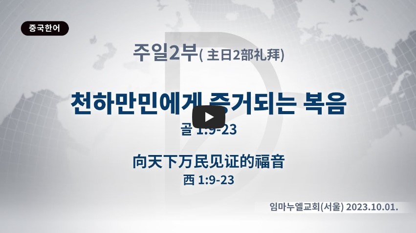 [구분] 주일 2부 [날짜] 2023. 10. 1 [강사] 류광수 목사 [정리] 사단법인 세계복음화전도협회 [제목] 천하만민에게 증거되는 복음 [본문] 골 1:9-23 9 이로써 우리도 듣던 날부터 너희를