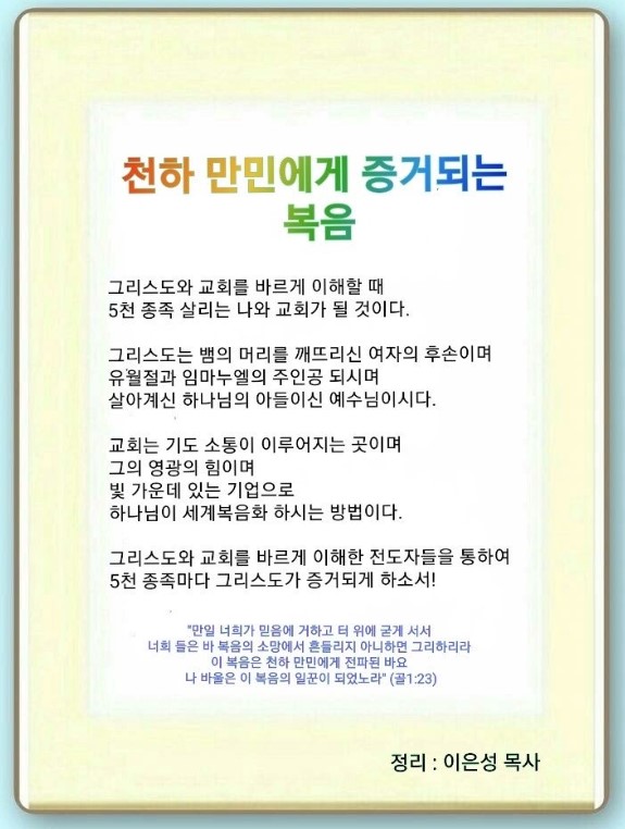 기도 소통이 이루어지는 곳이고,(골 1:9) 그의 영광의 힘이며(골 1:11) 빛 가운데 있는 기업입니다.(골 1:12-13) 우리는 5천 종족이 가서 올바른 교회를 세우고 세계복음화할 수 있도록 만들어야 됩니다.