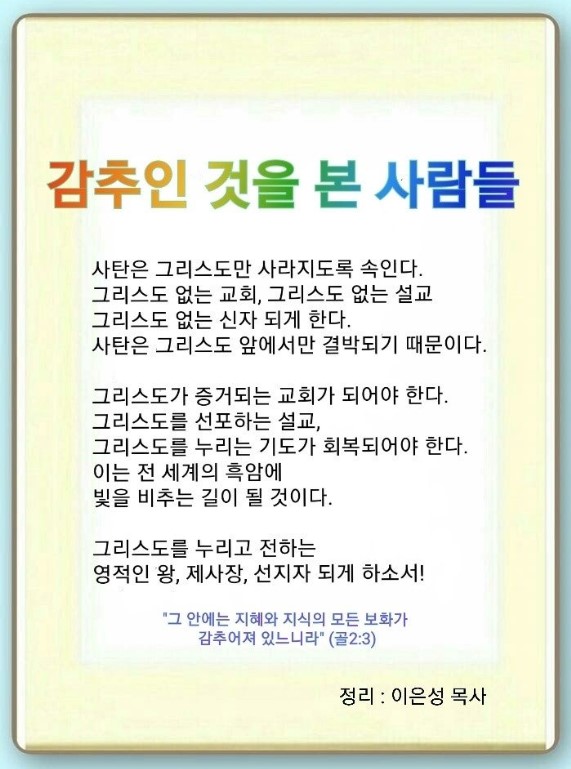 인터넷총국 (홈페이지 http://data.rutc.com) 후원: (국민은행) 856701-04-233309 (사)세계복음화전도협회 인터넷총국 분류 주일1부 예배- 2023년 제123RUTC응답 25 제목 감추인 것을 본 사람들 성경 골로새서 2:
