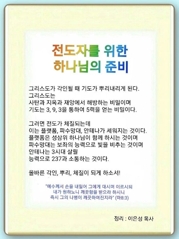 전도는 그리스도를 통한 구원으로, 3저주에서(사탄, 지옥, 재앙) 해방하는 것입니다. 이것이 각인되면 3‧9‧3을 가지고 다른 세계를(엡 2:2) 기도로 누리게 되고, 그 결과 5력이 생기게 됩니다. 그러면 각인된 그리스도와 기도가 내게 뿌리내리고 체질되어 계속 역사가 일어납니다. 7재앙을 막은 사람들은 그리스도로(창 3:15, 출 3:18, 사 7:14, 마 16:16) 각인된 사람들입니다. 구약시대는 세 절기, 성막, 언약궤의 주인공인 그리스도에 각인된 사람들을 통해서 일어난 역사입니다. 신약시대는 예수로 각인된 결과로 망대가 세워졌습니다. 성삼위 하나님이 함께하시는 플랫폼, 보좌의 능력으로 빛을 비추는 파수 망대, 3시대 살릴 능력으로 237과 소통되는 안테나가 세워진 것입니다. 이렇게 하나님이 함께하시는 응답을 누리면 전도가 되어집니다.