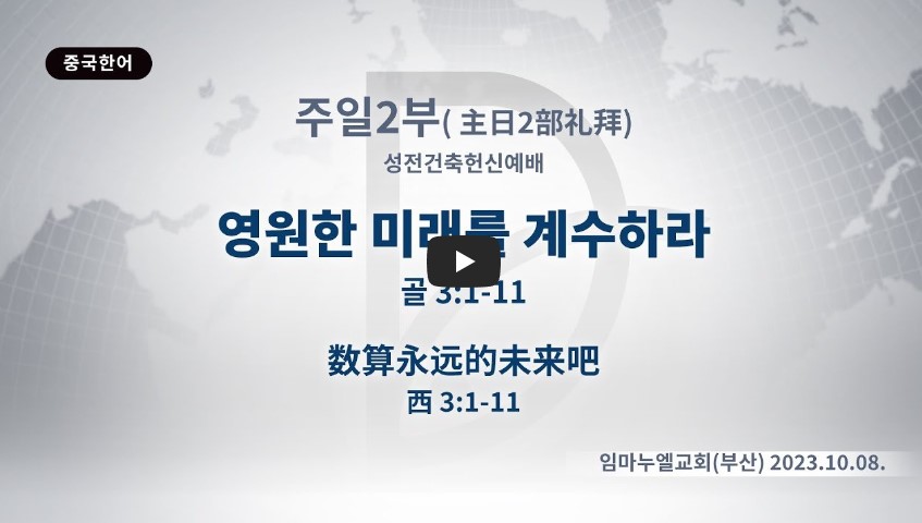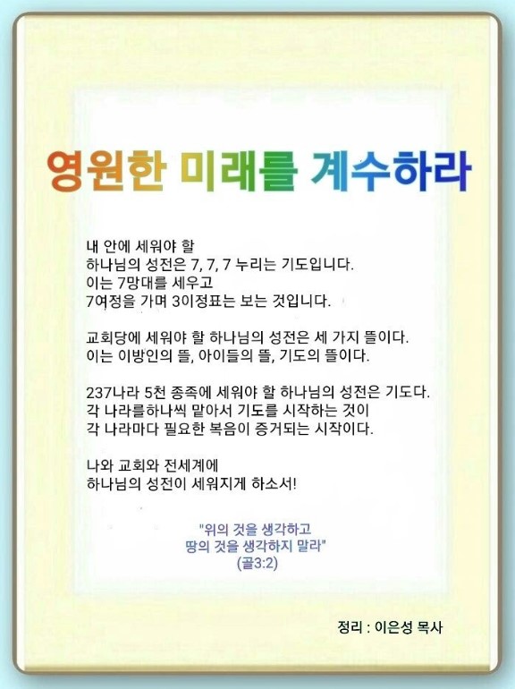 인터넷총국 (홈페이지 http://data.rutc.com) 후원: (국민은행) 856701-04-233309 (사)세계복음화전도협회 인터넷총국 분류 주일2부 예배- 2023년 제123RUTC응답 25 제목 (성전건축헌신) 영원한 미래를 계수하라