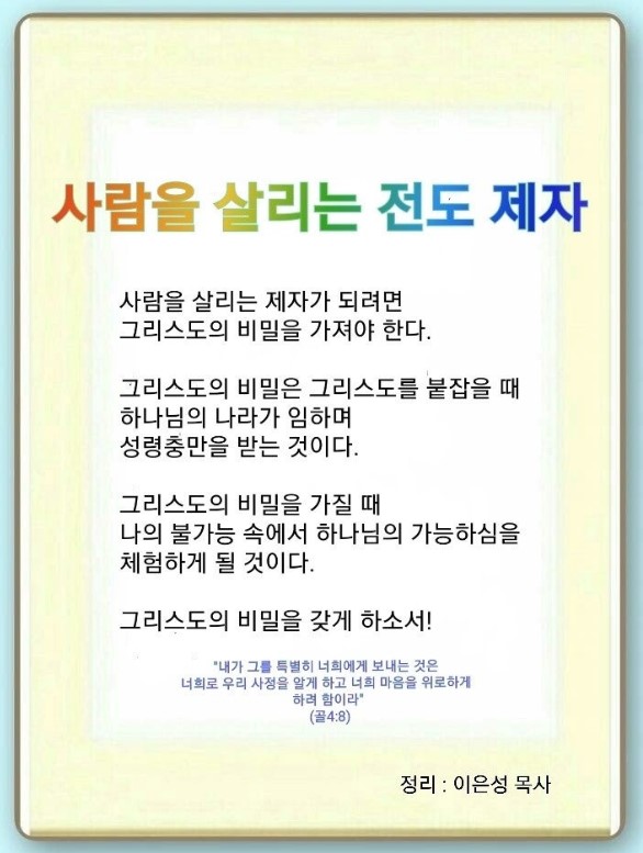 사람을 살리는 제자가 되려면 어떻게 해야 될까요? 그리스도의 비밀을 가져야 합니다.(골 4:3) 첫째, *7망대와 *7여정, *3이정표를 알아야 합니다. 둘째, 이 비밀을 현장에 나타내야 됩니다.(골 4:4) 요셉처럼 모든 것을 기도로 바꾸면 됩니다. 셋째, 미래를 미리 알려주는 비밀입니다. 예수께서는 바울을 이스라엘과 이방인과 왕 앞에 세우기 위해 택하셨음을 알려주셨습니다. 우리에게 오직 성령이 임하면 권능을 받고 땅끝까지 증인이 되리라고 하셨습니다. 또 영세 전에 감추어 둔 것과 세세무궁토록 있을 것을 지금 나타내신다고 하셨습니다.(롬 16:25-27) 이 비밀은 주는 사람과 받는 사람, 가진 사람만 아는 것입니다.