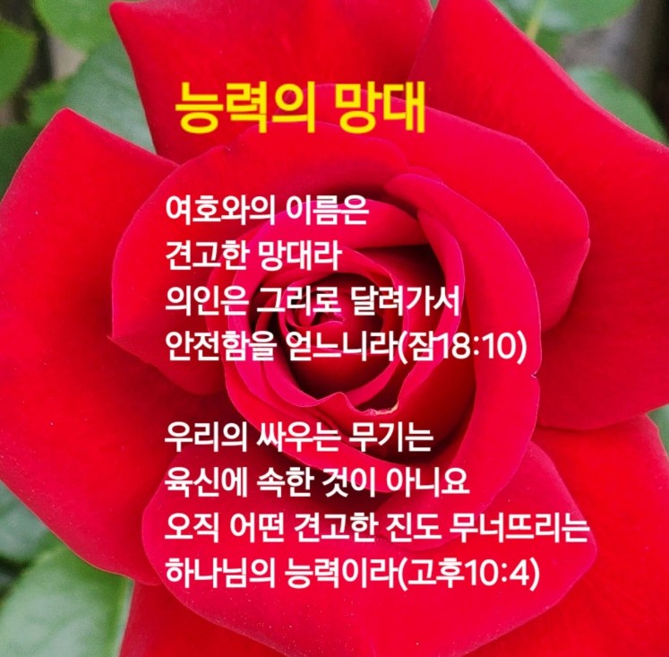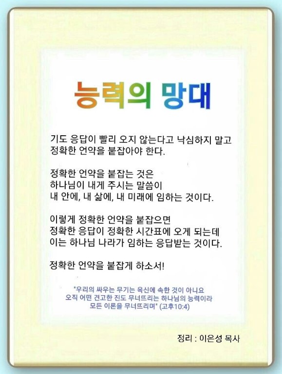 고린도후서 10:3-5 / 우리의 싸우는 무기는 육신에 속한 것이 아니요 오직 어떤 견고한 진도 무너뜨리는 하나님의 능력이라 모든 이론을 무너뜨리며 (4)