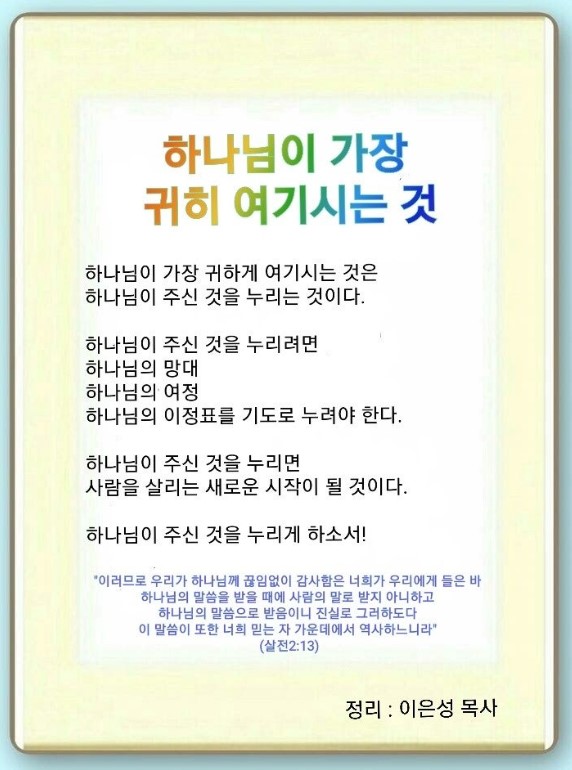 하나님이 가장 귀히 여기시는 것은 하나님이 주신 것을 누리면 된다. 하루에 한 번쯤은 하나님이 주시는 힘을 얻고 기도하는 시간이 있어야 된다. 저는 호흡하면 서 기도로 누린다. 성삼위, 보