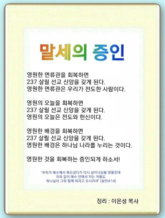 말세는 예수께서 승천하신 때부터 재림 때까지의 기간을 말합니다. 우리는 여기에 증인입니다. 그 기간에 우리가 하는 것이 세계복음화입니다. 237, 5천 종족을 살리려면 1천 망대를 세워야 합니다. 거기에 교역자, 중직자, 다민족 지도자가 될 다민족 제자가 와서 기도할 수 있는 자기 방이 있어야 합니다. 또한 쉼과 힘을 얻고 선교 포럼을 할 수 있어야 하고, 자료를 남겨 차세대가 와서 볼 수 있어야 합니다. 또한 교회 안의 성도가 잘못해도 이방인에게 하듯 하지 말아야 합니다. 그러면 극단적 율법주의와 신비주의, 종말주의가 일어나고, 흑암 세력이 문화와 경제, 후대를 장악하게 됩니다. 237을 살릴 선교 신앙을 가지기 위해서 회복해야 할 세 가지가 있습니다.