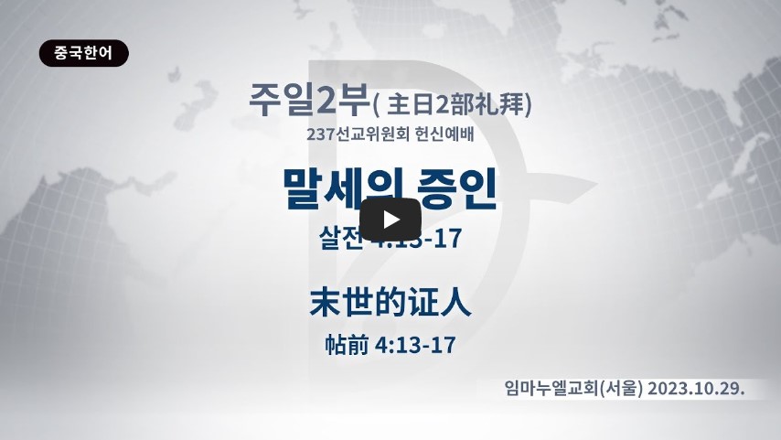 말세는 예수께서 승천하신 때부터 재림 때까지의 기간을 말합니다. 우리는 여기에 증인입니다. 그 기간에 우리가 하는 것이 세계복음화입니다. 237, 5천 종족을 살리려면 1천 망대를 세워야 합니다. 거기에 교역자, 중직자, 다민족 지도자가 될 다민족 제자가 와서 기도할 수 있는 자기 방이 있어야 합니다. 또한 쉼과 힘을 얻고 선교 포럼을 할 수 있어야 하고, 자료를 남겨 차세대가 와서 볼 수 있어야 합니다. 또한 교회 안의 성도가 잘못해도 이방인에게 하듯 하지 말아야 합니다. 그러면 극단적 율법주의와 신비주의, 종말주의가 일어나고, 흑암 세력이 문화와 경제, 후대를 장악하게 됩니다. 237을 살릴 선교 신앙을 가지기 위해서 회복해야 할 세 가지가 있습니다.
