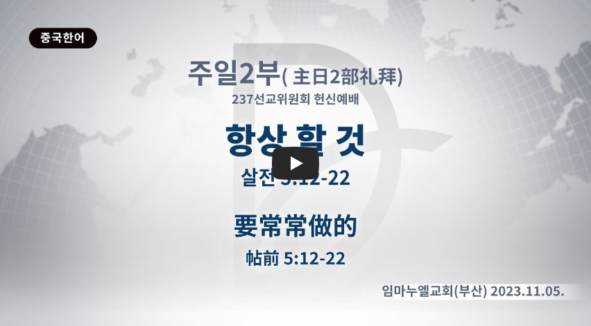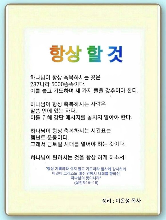 데살로니가전서 5:12-22 / 항상 기뻐하라 쉬지 말고 기도하라 범사에 감사하라 이것이 그리스도 예수 안에서 너희를 향하신 하나님의 뜻이니라 (16-18)