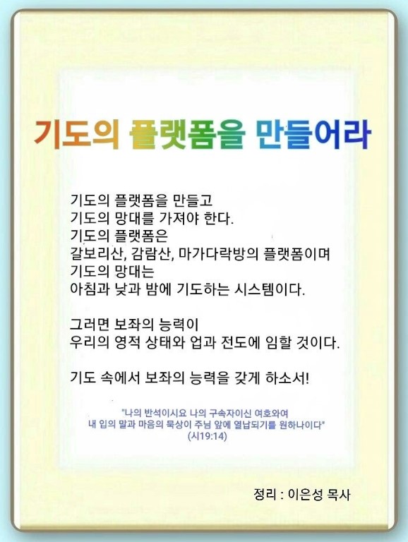 대부분 성도는 기도를 잘 모릅니다. 렘넌트 때 기도의 플랫폼을 세워야 됩니다. 기도의 플랫폼을 세우려면 큰 집회나 대회에서 하나님이 주시는 큰 전환점을 찾아야 합니다. 그래야 매주 강단 메시지에서 흐름을 보게 됩니다. CVDIP는 기도의 여정입니다. 먼저 불신자의 것으로 각인되어 있는 망대를(숨은 플랫폼) 무너뜨려야 합니다. 중고대청 때가 처음이자 마지막 기회입니다. 여기에 가장 필요한 것은 무엇일까요? 렘넌트 7명은 상황과 문제, 갈등, 위기에 빠지지 않고, 자신의 수준, 기준, 표준에 머물지 않았습니다. 이때 참 복음이 각인됩니다. 이 사실을 모르면 후대가 노예, 포로, 속국, 전쟁, 유랑민으로 가게 됩니다. 한 사람만 이 사실을 깨닫고 망대를 세우면 모든 것을 살릴 수 있습니다. 지금부터 하나님의 것을 회복하는 플랫폼을 만들어야 됩니다. 플랫폼의 터는 여러분의 마음입니다. 고요하고 평안한 시간을 가지되 모든 일에 의미를 찾고, 집중력을 회복하면 능력이 무엇인지 알게 되고, 시공간 초월과 치유의 역사가 일어납니다.