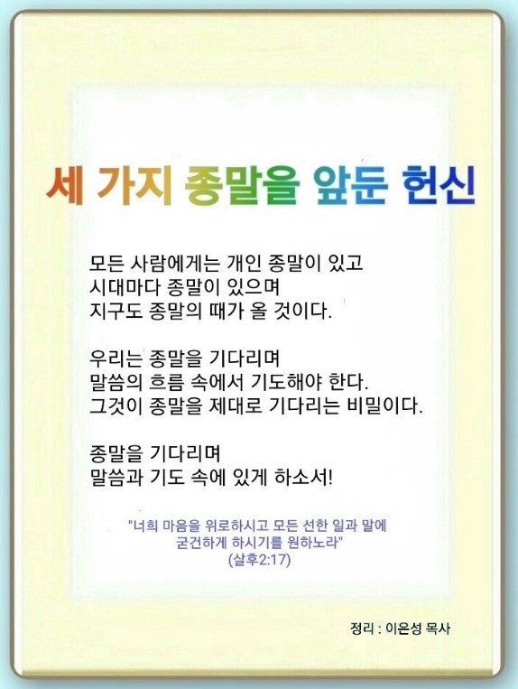 지구 종말입니다.”마지막 때 주의 강림에 대한 이야기에 미혹되지 말라. 큰 대적자가 일어나고, 배교하고 큰일이 일어날 것이다. 능력과 기적을 보여주며 혼란을 줄 것이다.”라고 했습니다.