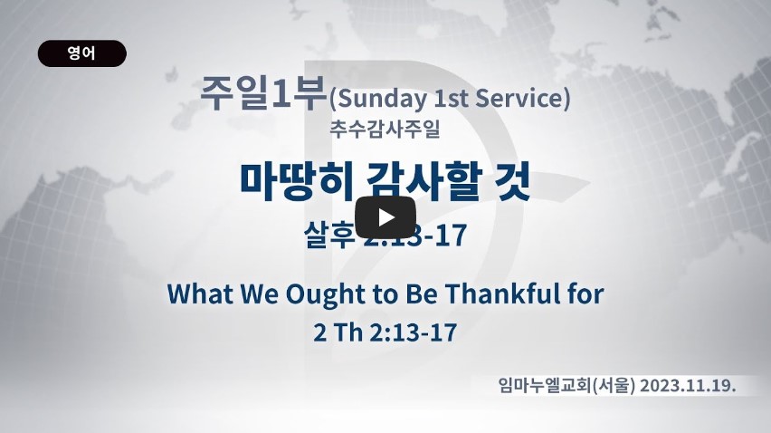 처음부터 우리를 택하사 성령으로 거룩하게 하셨습니다. 13절 이것은 그리스도의 영광을 얻게 하고,(14절) 영원한 위로와 좋은 소망을 주기 위함입니다.(16절) 기도할 때 하나님 나라가 임하도록 기도하고,(마 6:10) 하나님의 나라가 임했다고 전도하면 됩니다.(마 10:7) 하나님 나라가 임하면 집안을 살리고(마 12:28) 그의 나라와 의를 구하는 기도를 하면 됩니다.(마 6:33) 예수께서 40일 동안 말씀하신 하나님 나라의 일을(행 1:3) 바울은 석 달 동안 회당에서 담대히 설명했습니다.(행 19:8)