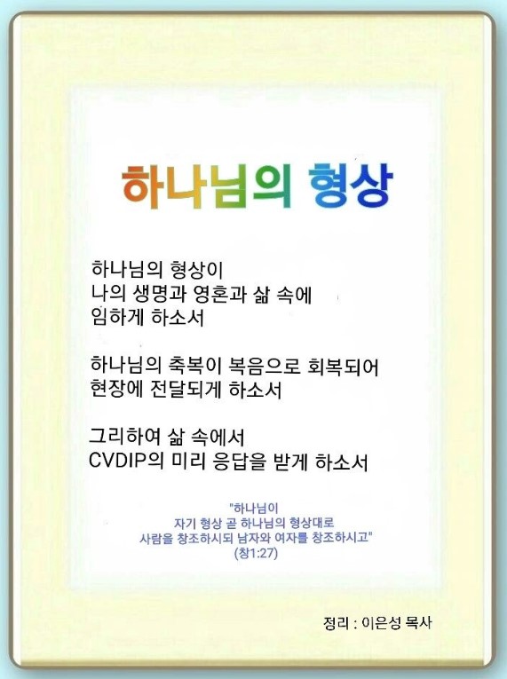 드디어, 정확한 말씀이(Covenant) 렘넌트들의 삶 속에 답으로 나오게 되고, 내게 정확하게 임해야 합니다. 이때부터 재앙 막는 길이(Vision) 보입니다. 드디어 24·25·영원이 되고(Dream) 하나님의 형상과 창조의 영으로 창조적 능력이 생깁니다.(Image) 그리고 보좌의 작품이 만들어집니다.(Practice) 이것이 CVDIP입니다. 이것을 렘넌트들이 가지고 있어야 합니다. CVDIP를 기도하고 있으면 미리 보입니다. 미리 보이면 미리 가지게 됩니다. 미리 가졌으니까, 미리 누리게 되고, 정복하게 됩니다. 정복도 하기 전에 미리 성취됩니다. 이것이 렘넌트의 답이요, 기도입니다.