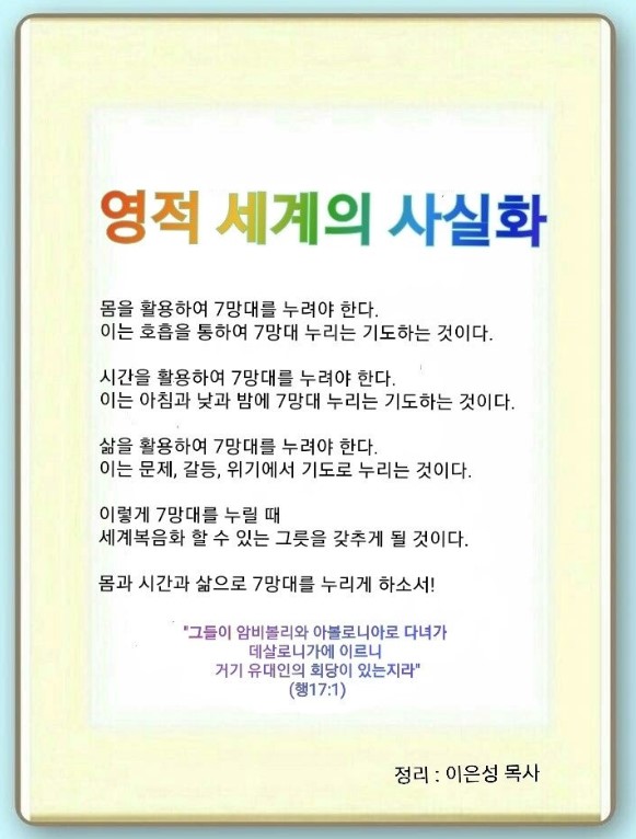 3단체는 영적 세계를 과학화시켰습니다. 그래서 우리가 가장 먼저 해야 될 것은 영적 세계의 사실화입니다. 뇌에 들어간 것은 몸을 움직이고 영혼 속에 각인되면 영원과 연결됩니다. 영적 과학인 기도를 알면 모든 것을 움직일 수 있습니다. 렘넌트 7명에게 사람 살리는 7망대가 임했습니다. 하나님은 7망대의 비밀을 알고 싸우지 않고 이긴 렘넌트 7명을 재앙 막는 자리에 세우셨습니다. 7망대의 축복을 누리면(24) 25 응답과 영원한 작품을 남기게 됩니다. 7망대는 예수께서 주신 천국 열쇠입니다. 이 열쇠를 가진 초대교회는 가장 위험한 시간에, 가장 위험한 장소에 모여 세계를 정복했습니다.(영적 서밋) 우리는 이 응답을 어떻게 받을 수 있을까요?